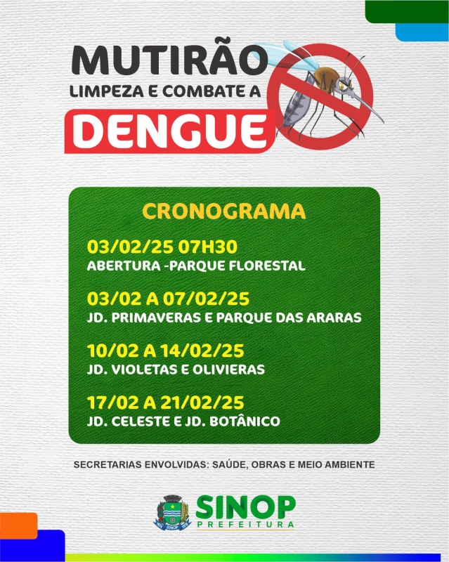 A Prefeitura de Sinop, por meio das Secretarias de Saúde, Obras e Meio Ambiente, promove um grande mutirão de limpeza para combater a proliferação do mosquito Aedes aegypti, transmissor das doenças dengue, chikungunya e zika. O mutirão inicia no dia 03 de fevereiro, com a abertura oficial às 07h30 no Parque Florestal, e seguirá até o dia 21 de fevereiro.
